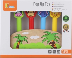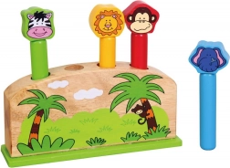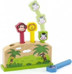 Acest joc pop-up din lemn cu animăluțe este o jucărie motrică ideală pentru început. Copiii introduc știfturile-animăluțe în orificii și, la apăsarea arcului, figurinele sar distractiv. Baza solidă din lemn, cu motiv de junglă, și animăluțele prietenoase invită la joacă repetată și dezvoltă răbdarea și concentrarea.