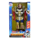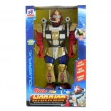 Acest robot din plastic, pe baterii, este o jucărie ideală pentru copiii de la 3 ani. Efectele luminoase și sonore vor captiva copilul și îi vor stimula imaginația. Robotul poate merge, iar mișcările sale interactive includ rotirea și manevrarea unei săbii și a unui scut.