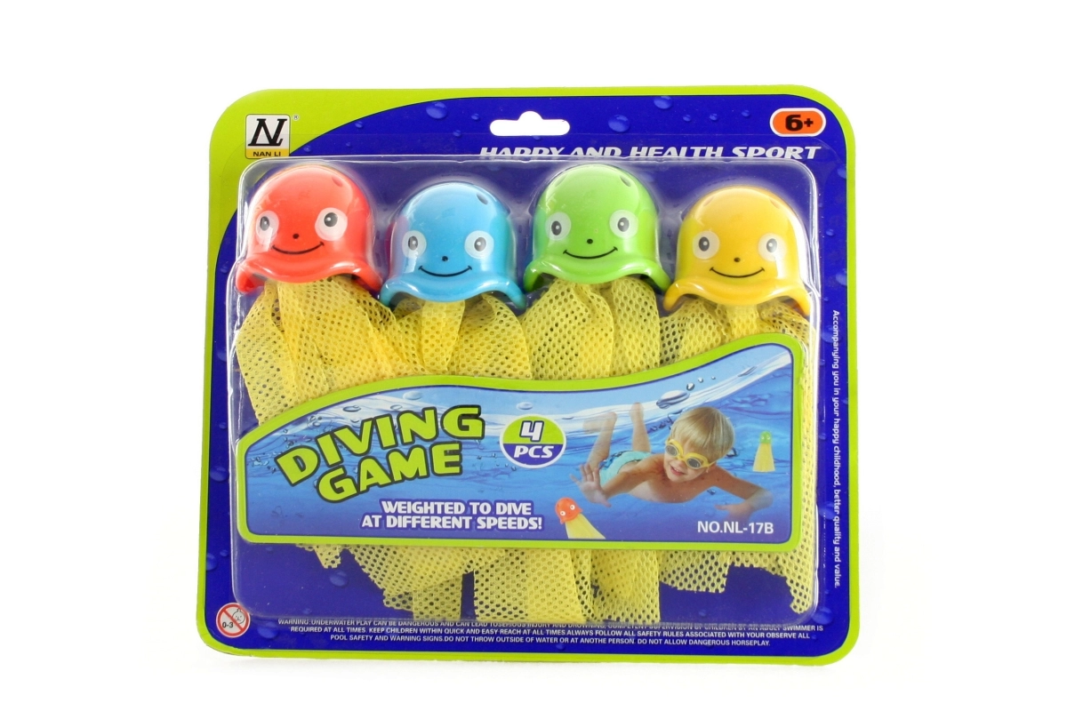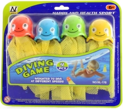 Set distractiv de caracatițe pentru scufundare pentru copii de la 6 ani, oferind o formă jucăușă de antrenament în apă. Patru caracatițe colorate, fiecare cu marcaj numeric diferit, susțin punctarea și spiritul competitiv, excelente pentru diversificarea antrenamentului de înot și scufundare sau pentru jocuri în piscina de acasă sub supravegherea unui adult.