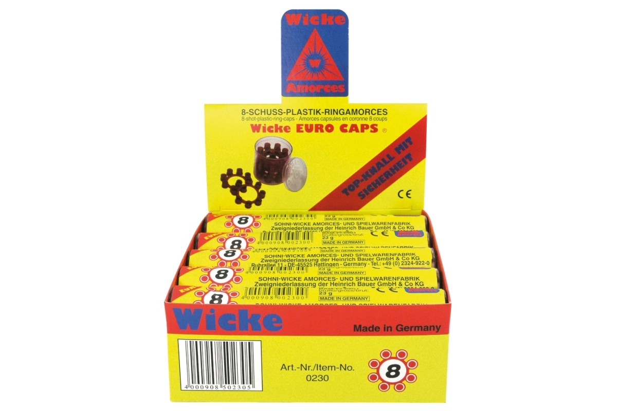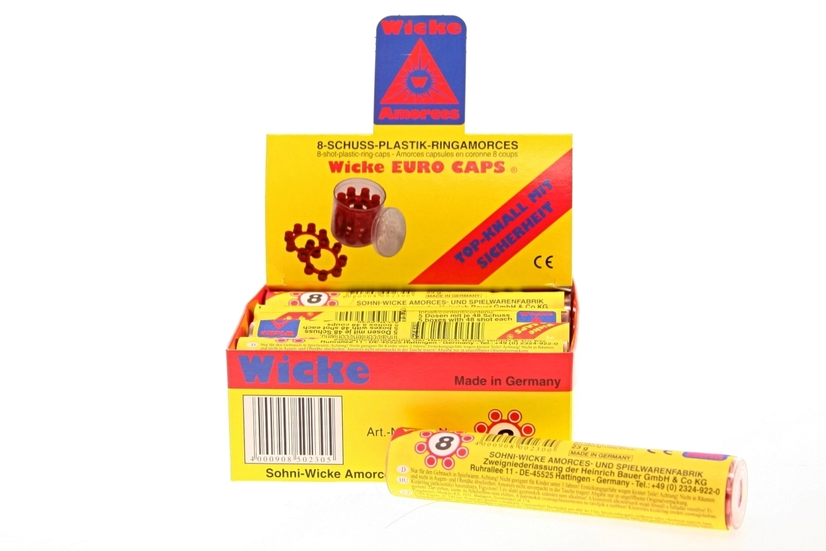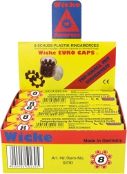 Capsule fiabile în formă de coroniță pentru pistoale de jucărie cu încărcător cu opt focuri. Un cilindru conține 5 cutii (în total 240 de focuri) și este ambalat într-o cutiuță din plastic practică. Ideal pentru joacă distractivă, recomandat de la 3 ani.