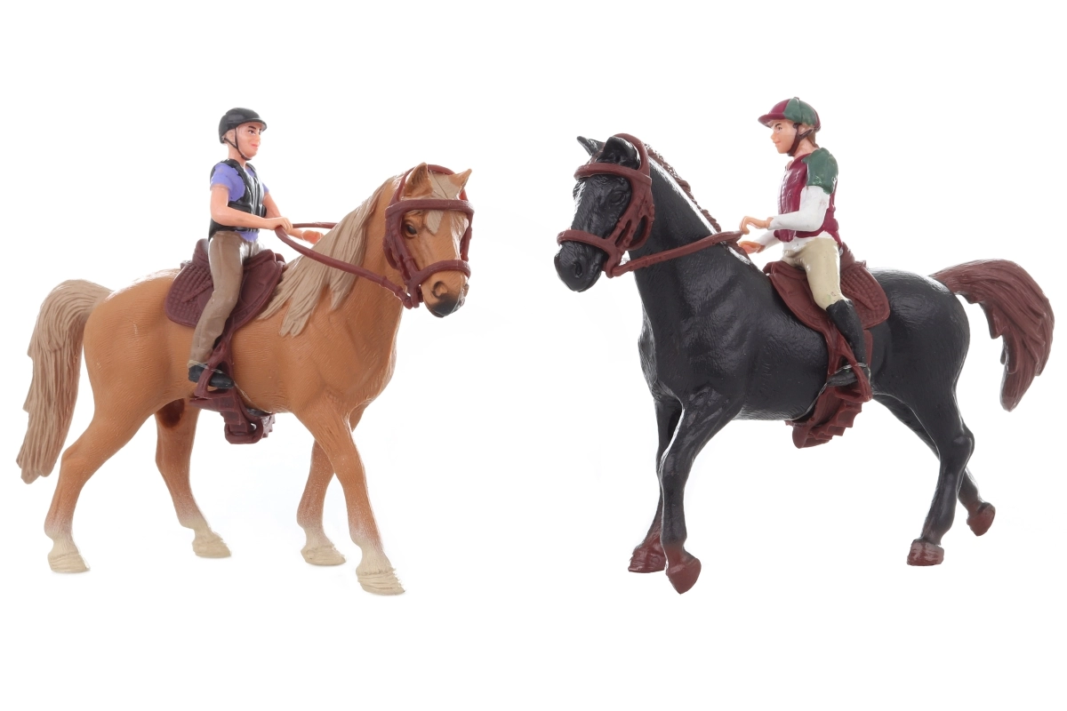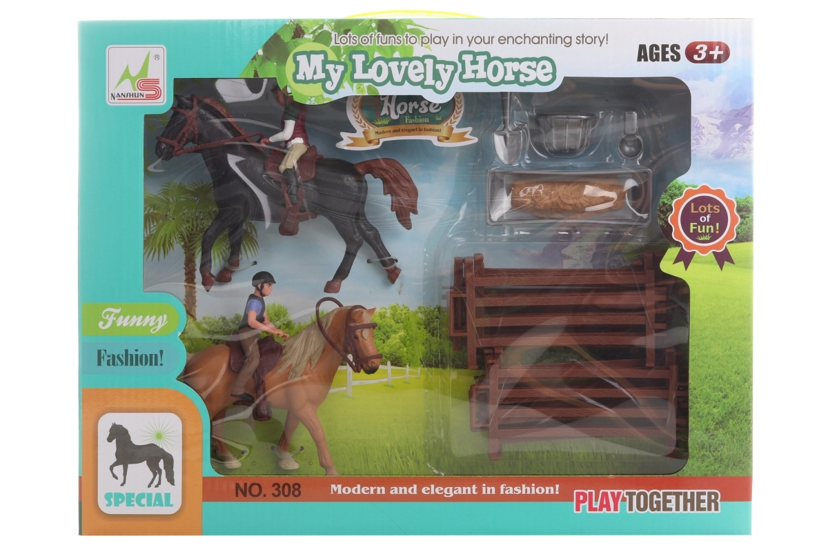 - Set complet – 2 cai, 2 călăreți, țarc și alte accesorii.