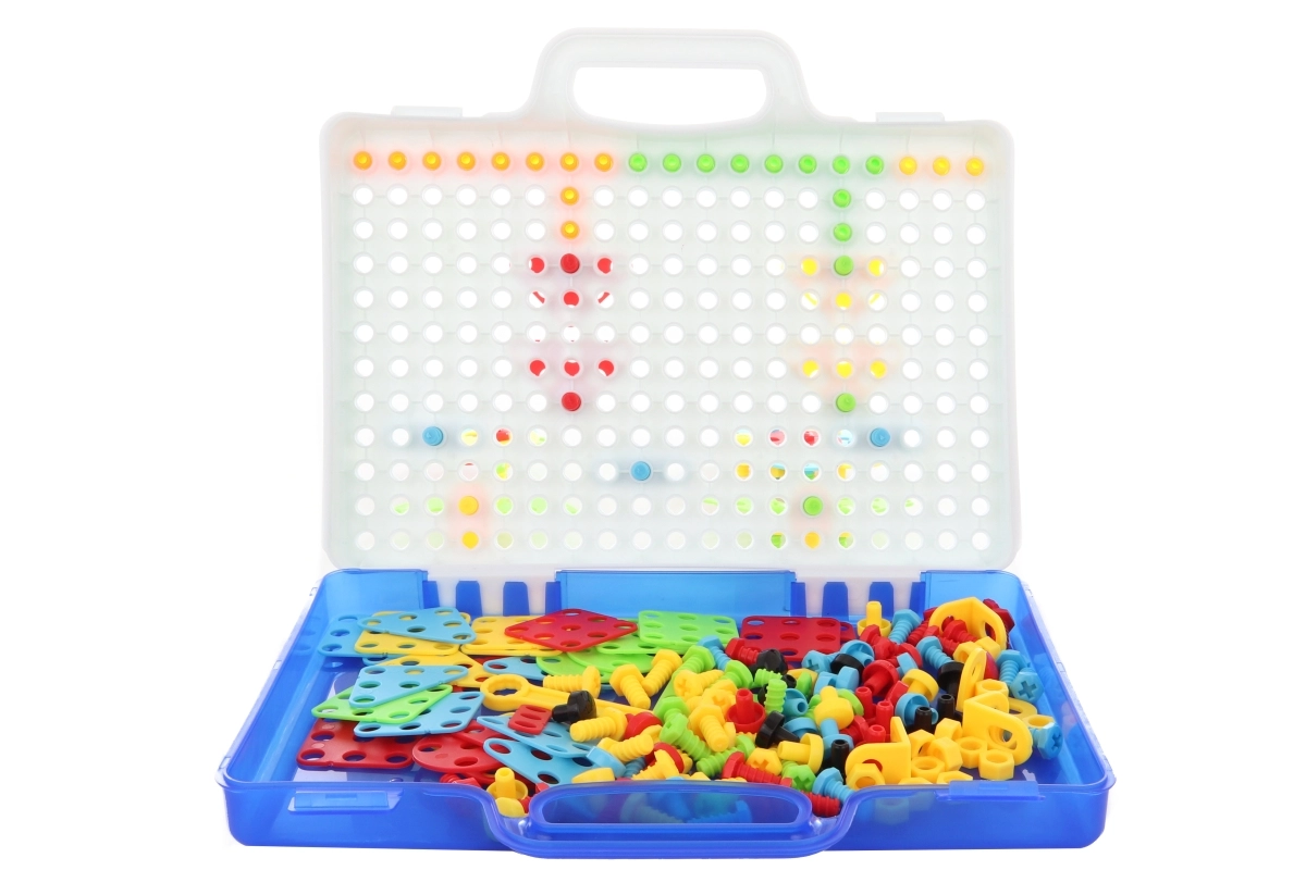 Creativul set de construcție cu șuruburi și bormașină oferă copiilor de la 3 ani ore de distracție și învățare. În geanta practică găsești 237 de piese, bormașină pentru copii, șurubelniță și instrucțiuni. Copiii își dezvoltă motorica fină, creativitatea și gândirea logică construind modele colorate și creații 3D pe plăcuța perforată.