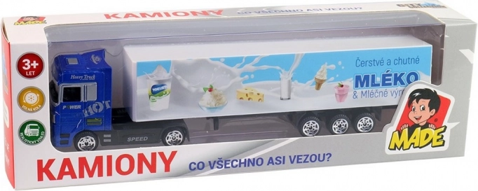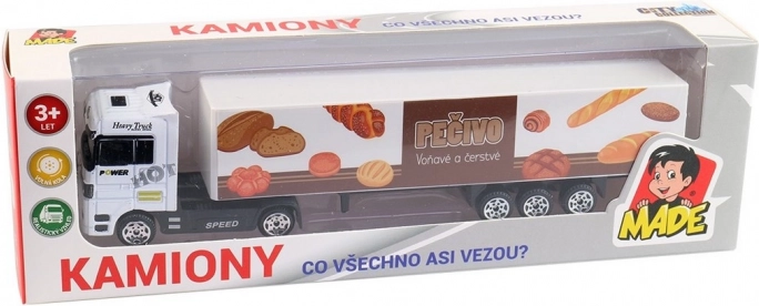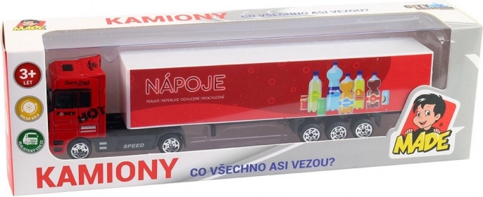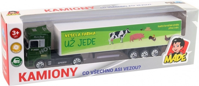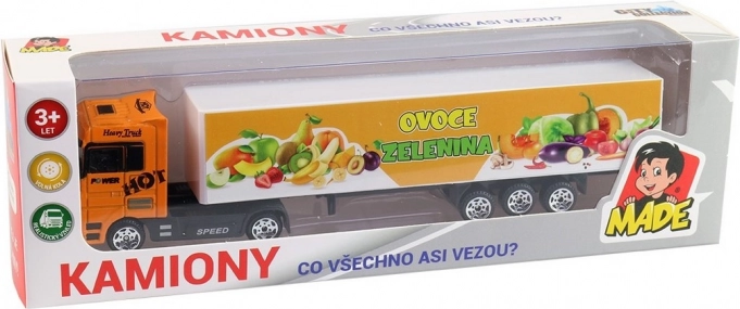 Camion colorat din plastic cu imprimeu ceh, lungime 20 cm. Ușor, rezistent și ideal pentru copii de la 3 ani. Excelent pentru dezvoltarea imaginației și a motricității.