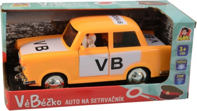 Mașină retro VB 17 cm cu mecanism pe inerție, sunet de motor și uși care se deschid. Design galben Securitatea Publică, PVC, ambalaj în limba cehă. Cadou grozav.