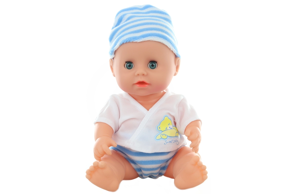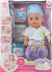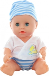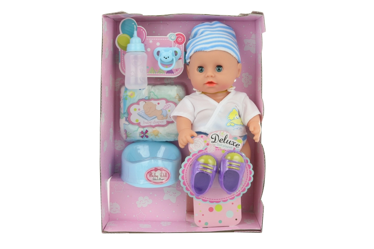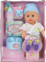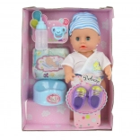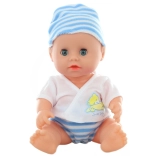 Un bebeluș drăgălaș de 30 cm îi va încânta pe toți micii îngrijitori. După introducerea bateriilor, emite sunete realiste și poate să facă pipi. Pachetul include ghetuțe, bavetă, biberon, farfurioară și alte accesorii pentru jocul de-a mama și tata. Ideal pentru copii de la 3 ani.
