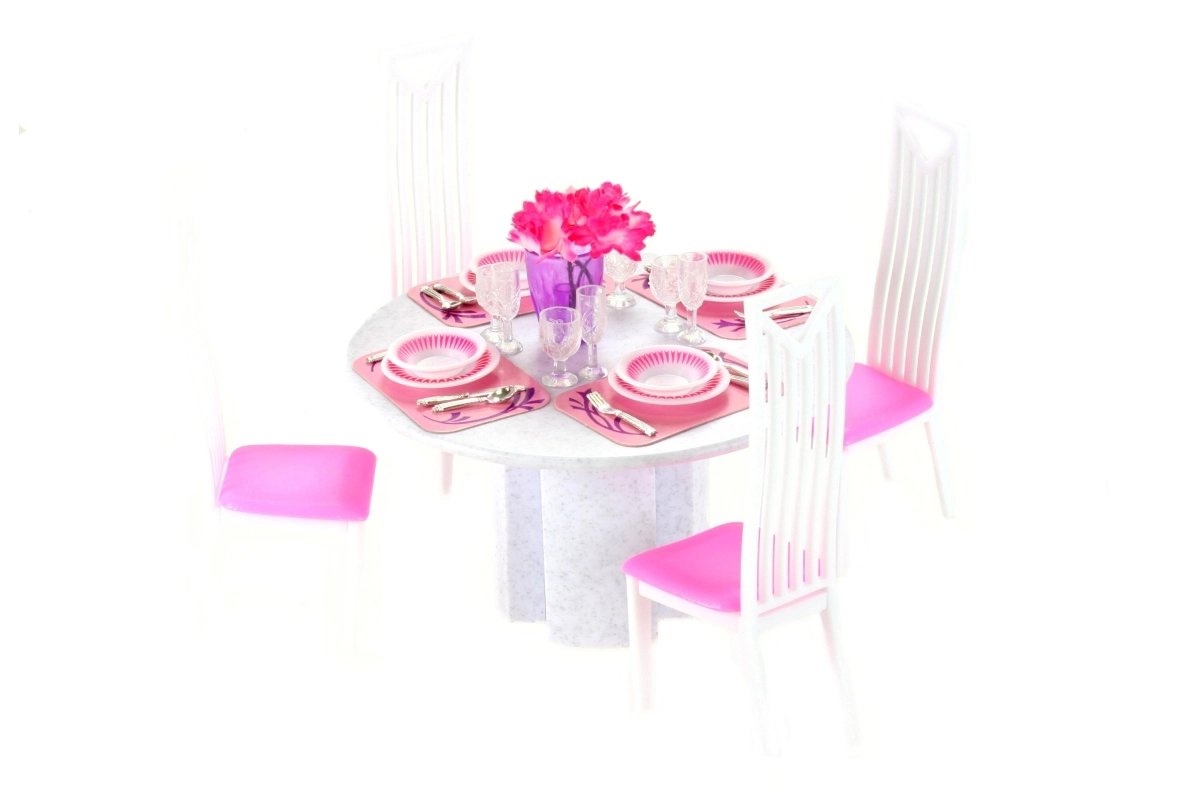Setul de masă stilat pentru păpuși Glorie transformă fiecare joacă a copiilor într-un festin realist. Include un masă rotundă, 4 scaune și 4 seturi complete de veselă. Ideal pentru joc creativ și dezvoltarea imaginației copiilor de la 3 ani.