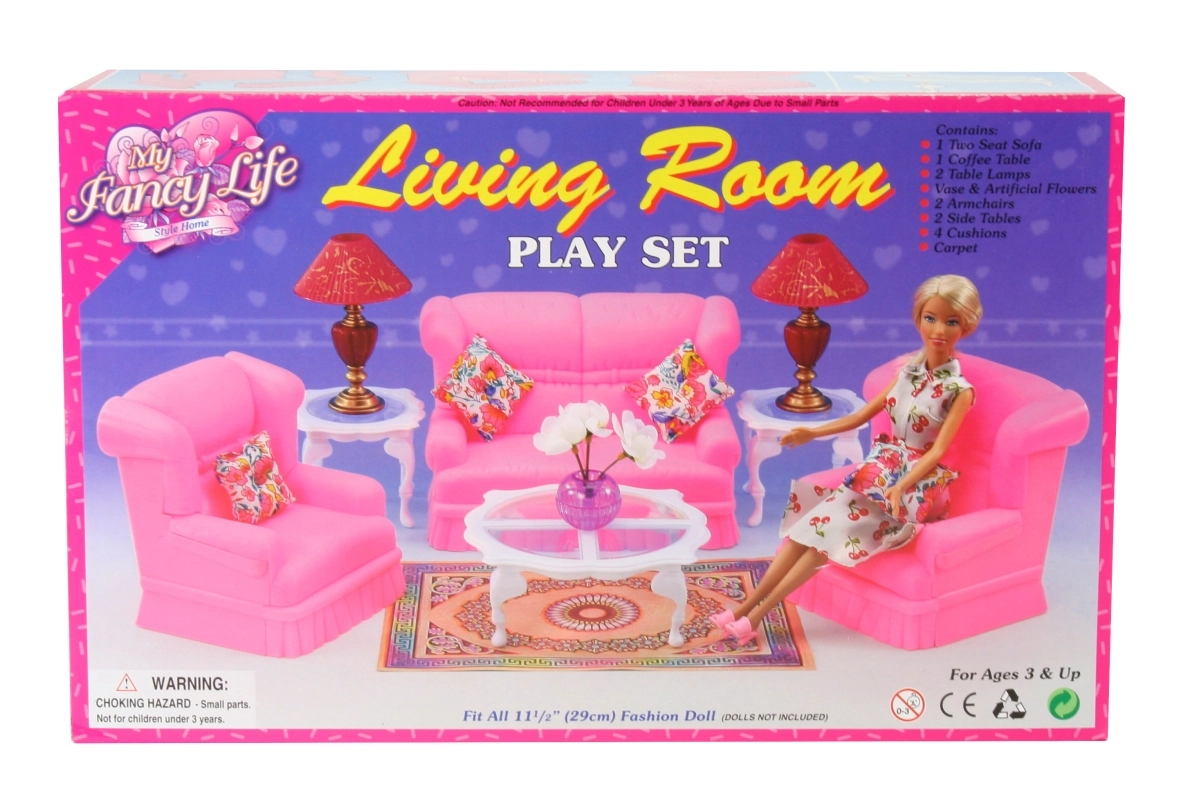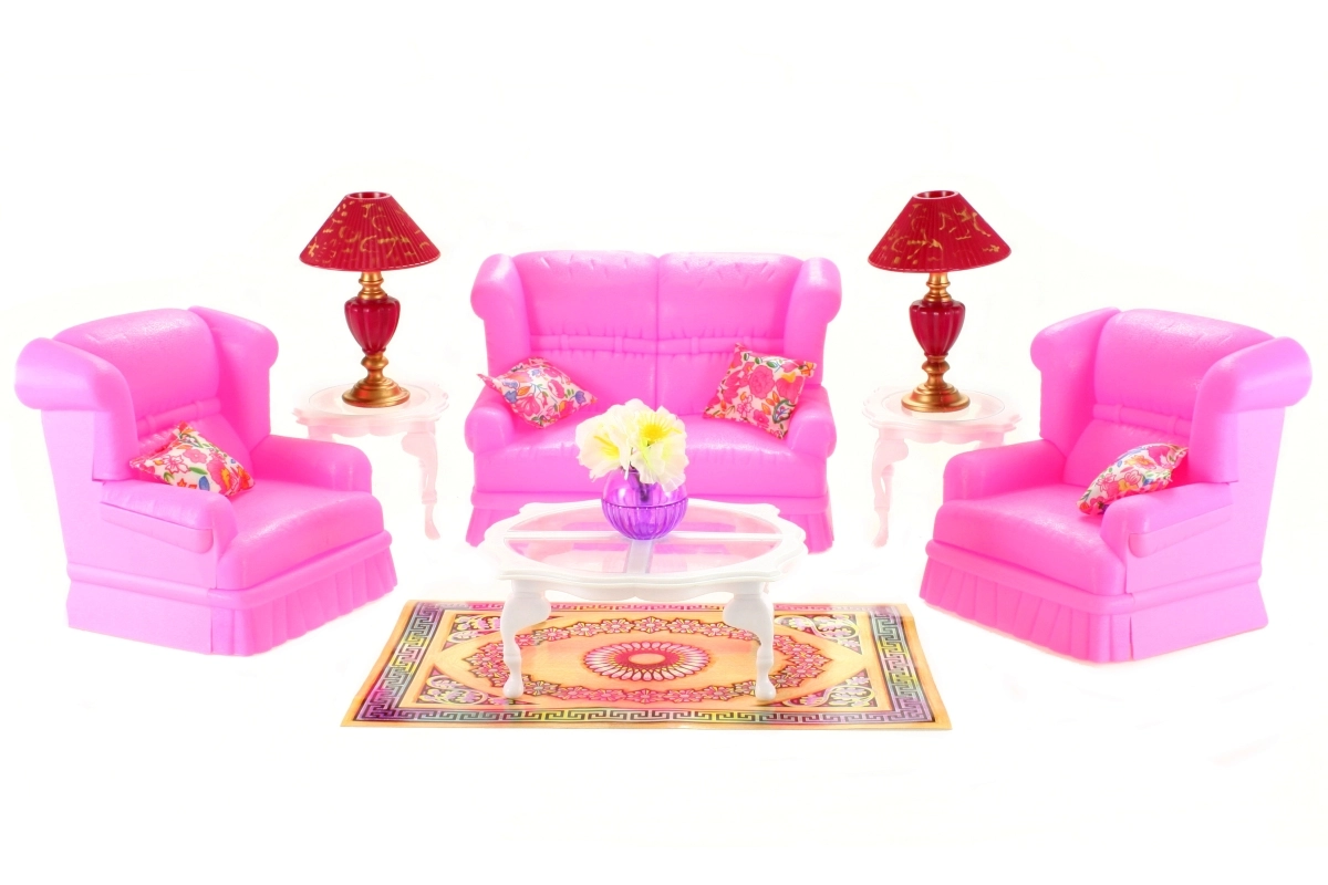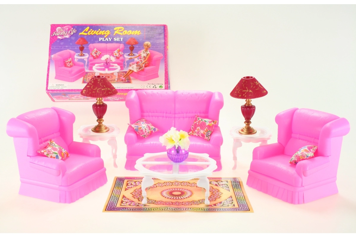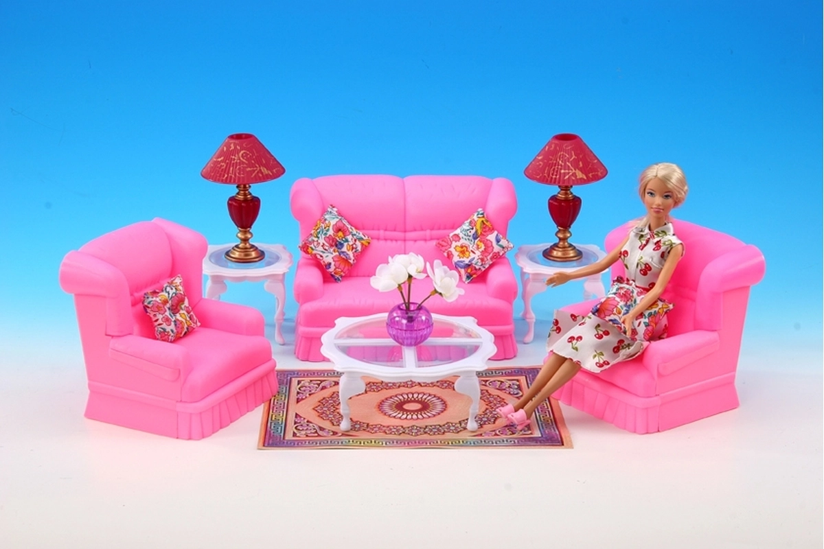 Setul de living stilat pentru păpuși GLORIE transformă orice căsuță într-un cămin primitor. Conține o canapea, două fotolii, măsuță de cafea și măsuțe auxiliare, lămpi și decorațiuni. Ideal pentru joc creativ și dezvoltarea imaginației. Mobilier complet pentru living, accesorii detaliate și material din plastic rezistent care va încânta copiii de la 3 ani.