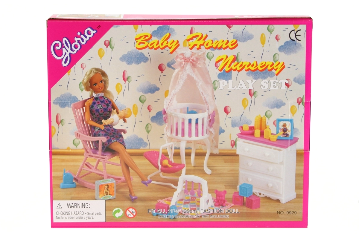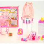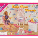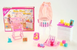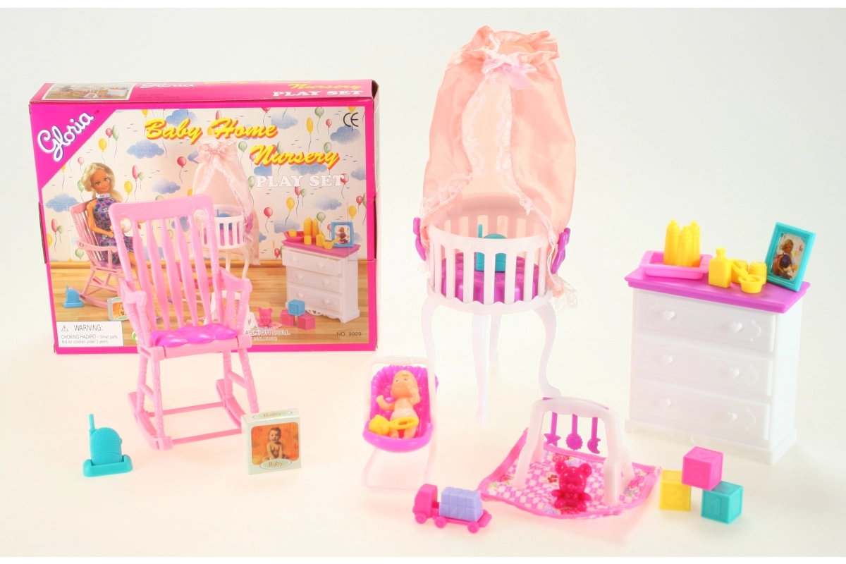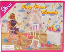 Un set complet pentru bebeluș de la marca Glorie aduce tot ce are nevoie camera de joacă pentru păpuși. Include o comodă cu sertar, pătuț cu baldachin, șezlong, scaun balansoar, accesorii pentru îngrijirea bebelușului și chiar un bebeluș. Ideal pentru copiii de la 3 ani, pentru dezvoltarea imaginației și a abilităților de îngrijire.