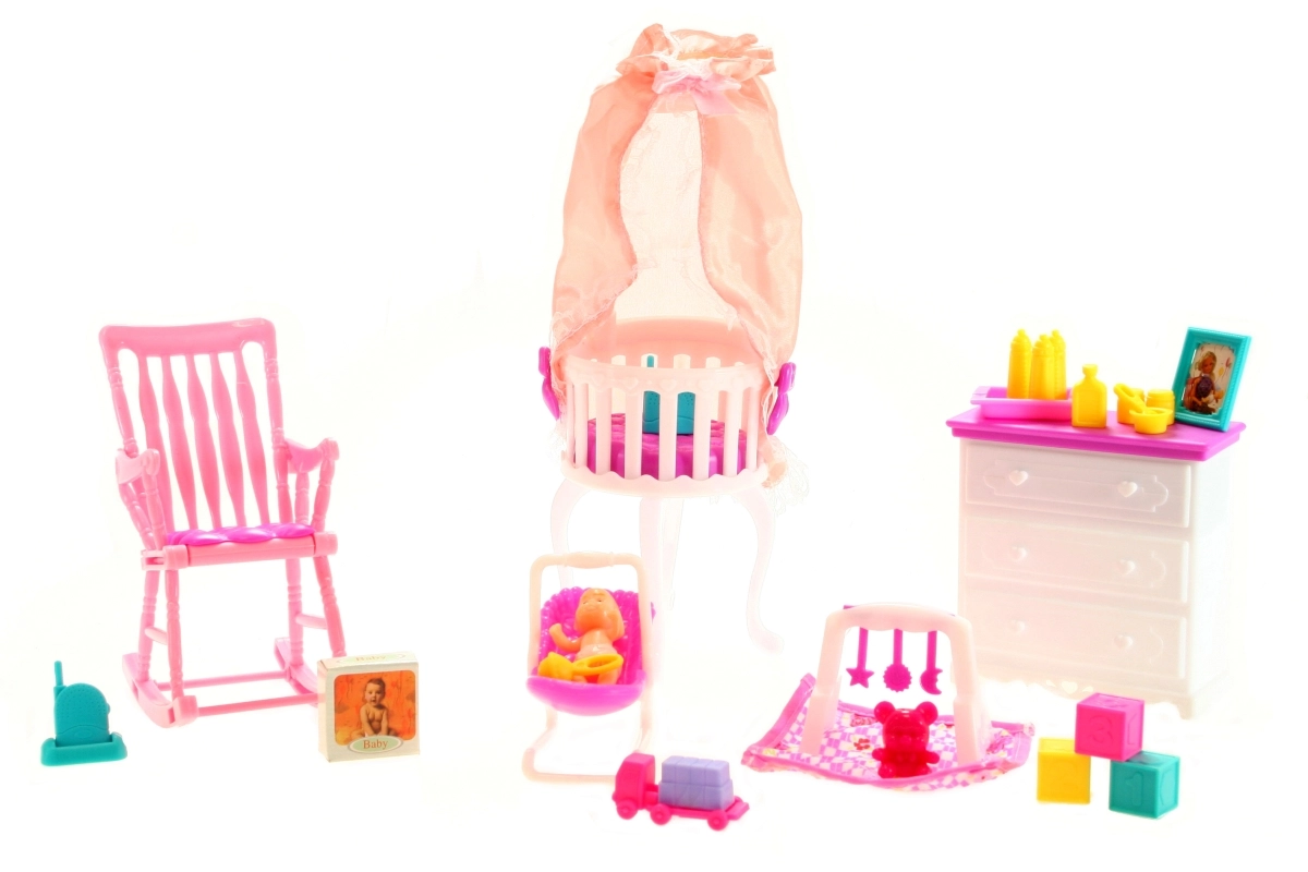 - Echipare completă: comodă, pătuț cu baldachin, șezlong, scaun balansoar, jucării și articole pentru bebeluș.