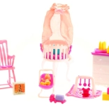 Acest set bogat echipat transformă orice joacă într-o experiență realistă. Copiii își pot amenaja propriul colțișor pentru bebeluș, pot depozita mărunțișurile în comodă, pot culca bebelușul în pătuțul cu baldachin și se pot legăna pe un scaun stilat. Setul susține excelent jocul creativ, dezvoltarea motricității fine și jocul de rol.