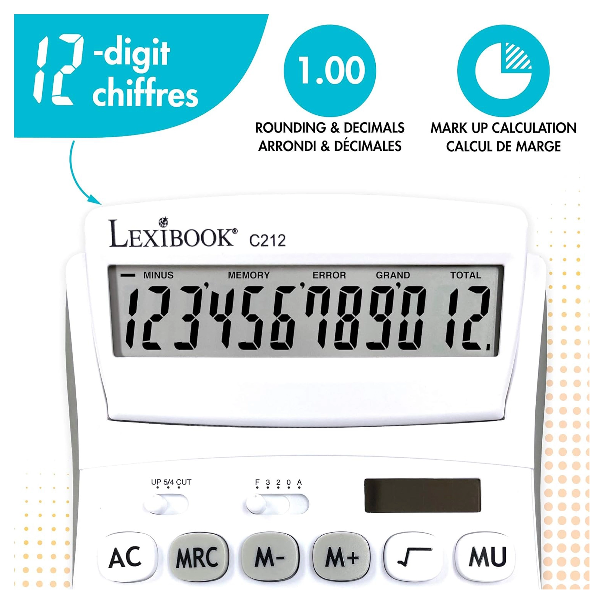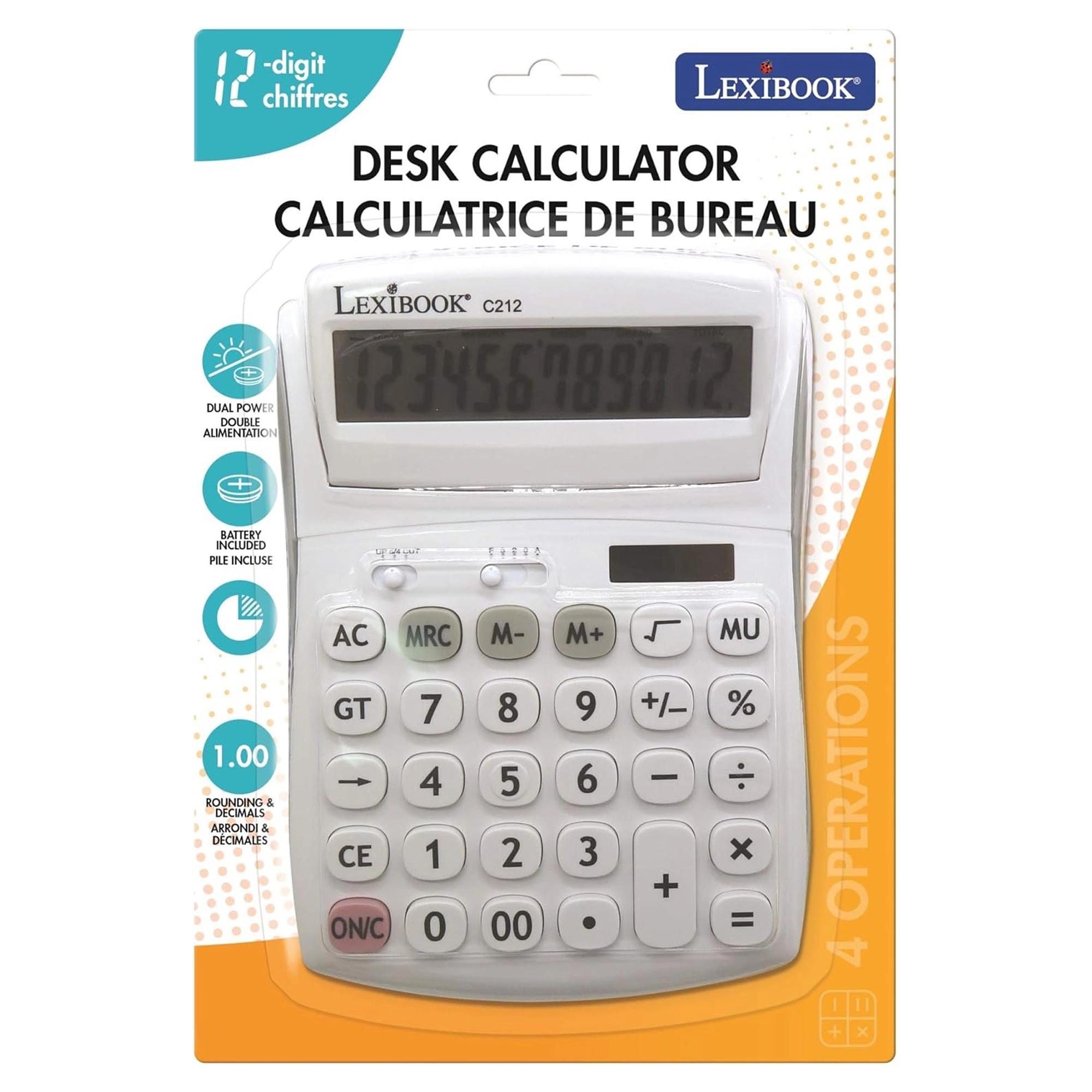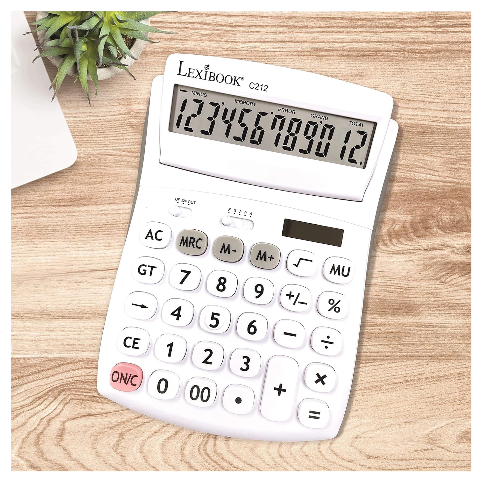 Practic, calculator de birou cu 12 cifre pentru birou, școală și casă, oferă ecran mare rabatabil, butoane rezistente, cauciucate și alimentare duală (baterie AG10 + solară). Permite selectarea zecimalelor și rotunjirea, are memorie pentru 3 numere, funcții de procente, rădăcină pătrată și calcul al marjei și include tasta de corecție pentru ștergerea ultimelor cifre.