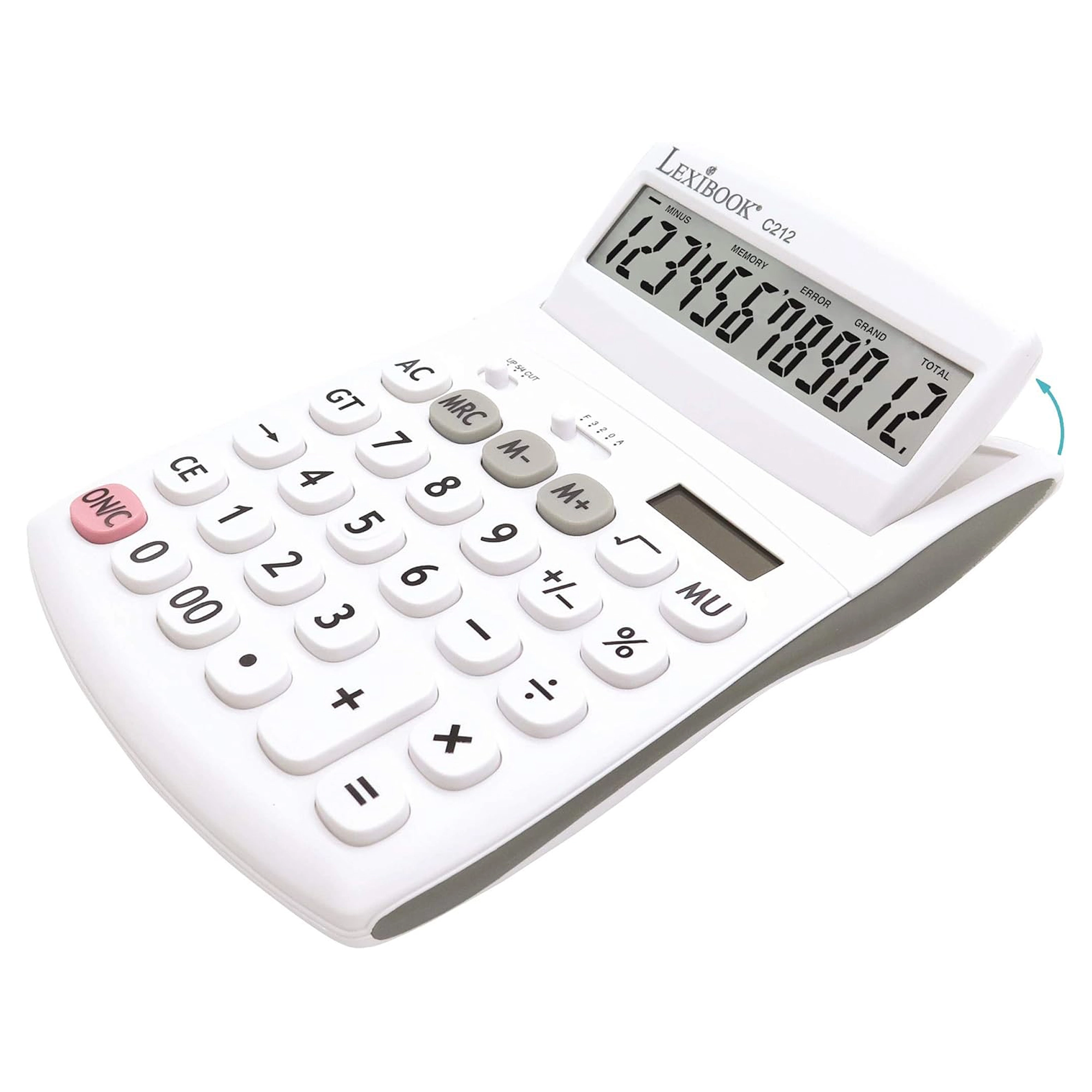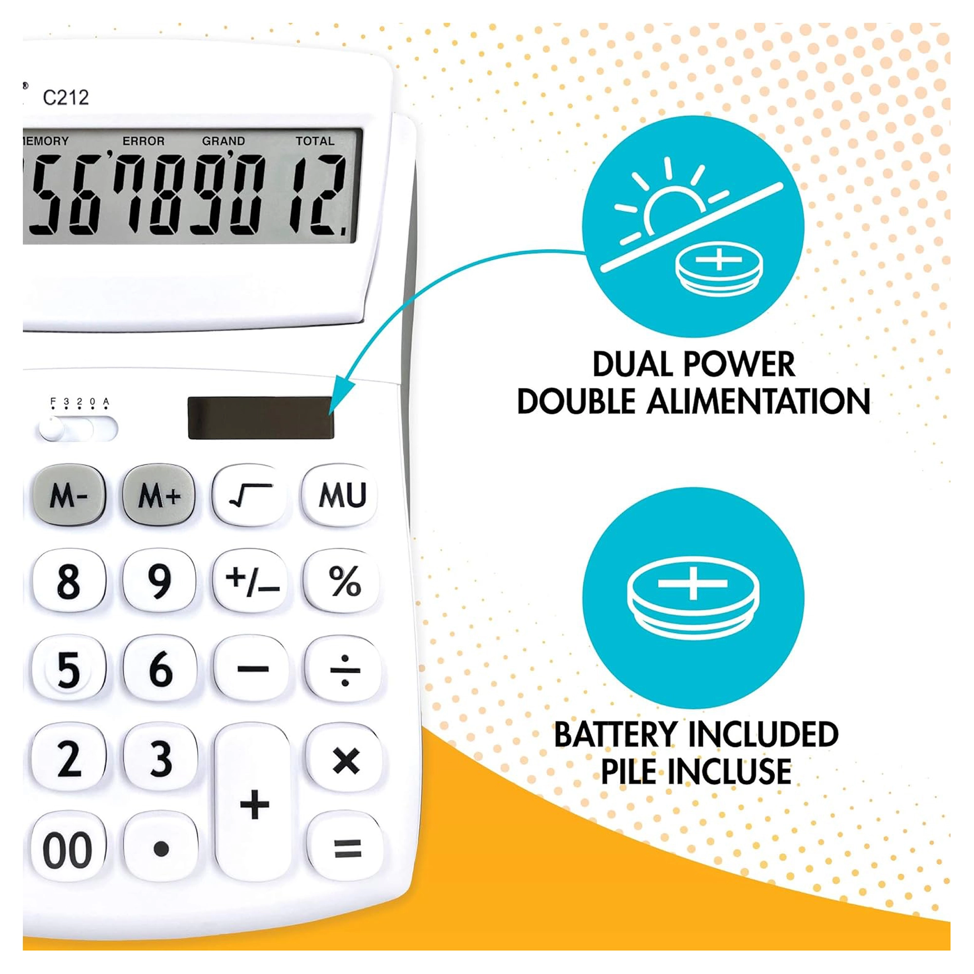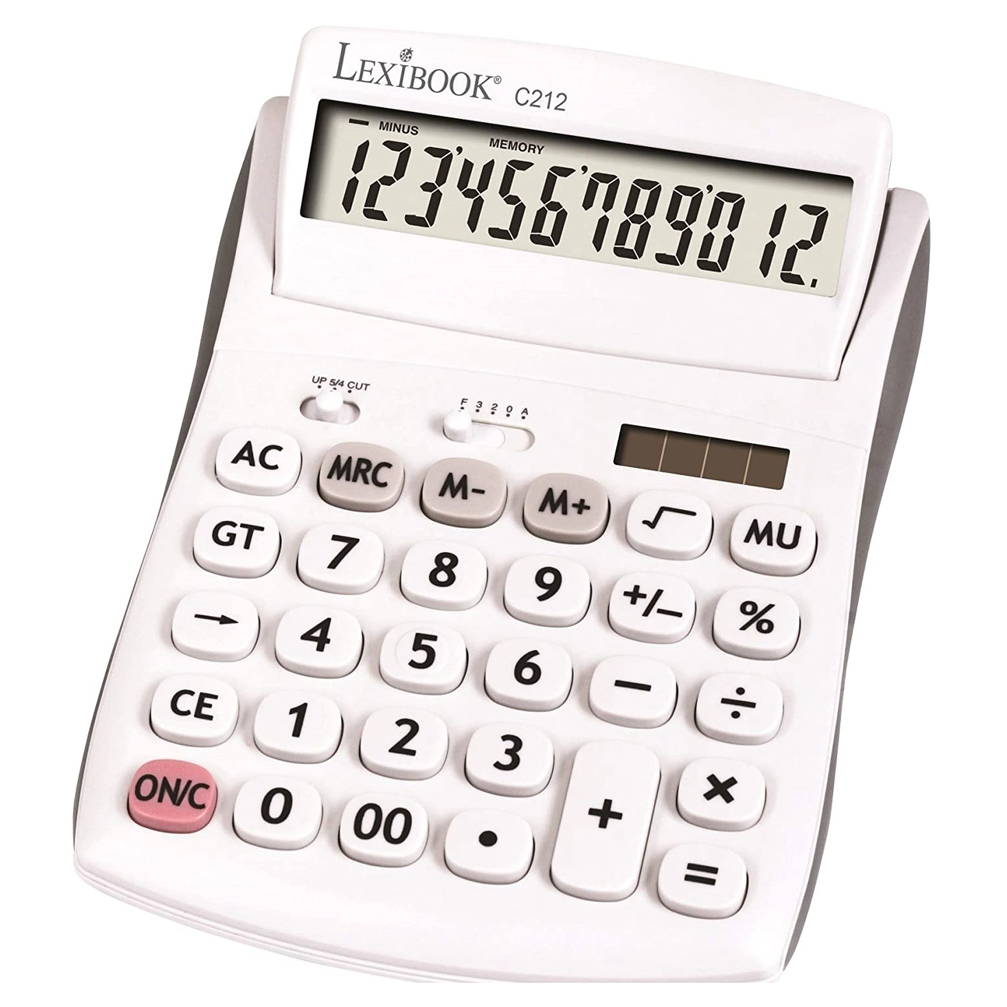 Practic, calculator de birou cu 12 cifre pentru birou, școală și casă, oferă ecran mare rabatabil, butoane rezistente, cauciucate și alimentare duală (baterie AG10 + solară). Permite selectarea zecimalelor și rotunjirea, are memorie pentru 3 numere, funcții de procente, rădăcină pătrată și calcul al marjei și include tasta de corecție pentru ștergerea ultimelor cifre.