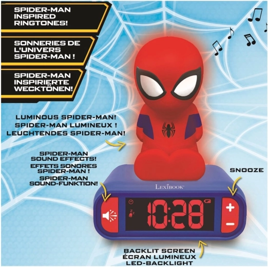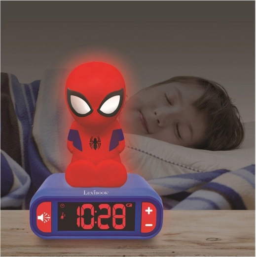 Ceas deșteptător cu lumină 3D de noapte Spider-Man oferă nopți liniștite și dimineți senzaționale, cu butoane de control prietenoase pentru utilizator, ecran LCD iluminat din spate și șase efecte sonore tematice.
