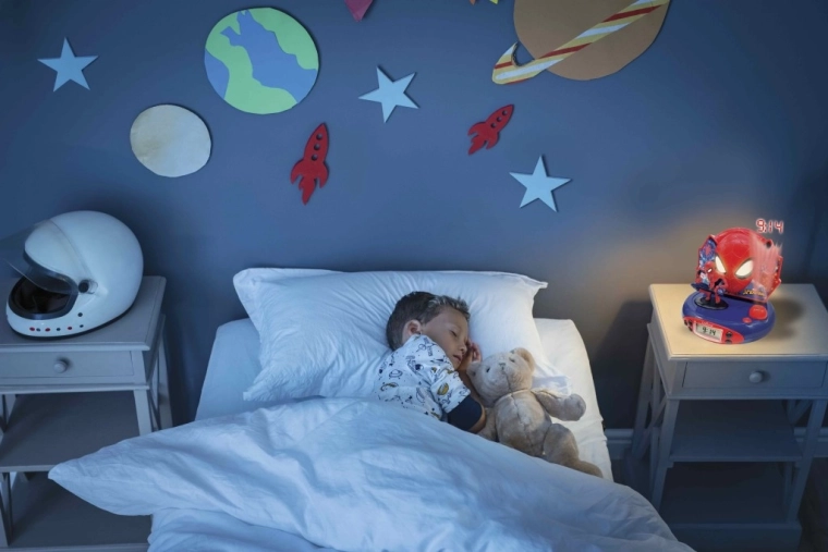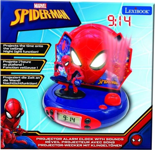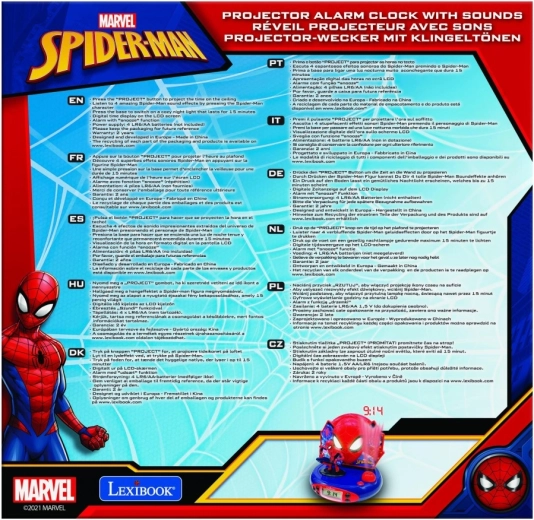 Ceasul deșteptător 3D pentru copii cu proiector SPIDER-MAN proiectează ora pe tavan și funcționează totodată ca lumină de noapte. Datorită ecranului LCD clar, funcției 12/24h, amânare cu 5 minute și sunete tematice, trezirea devine distractivă. Operare ușoară, oprire automată a luminii după 15 minute și proiecția orei îl fac un accesoriu ideal pentru camera copiilor.