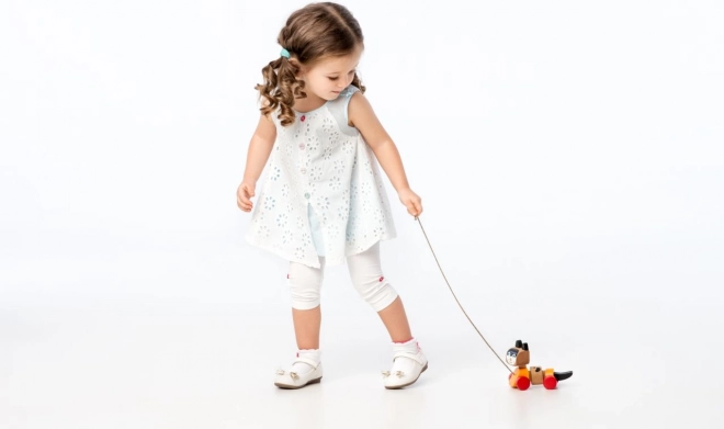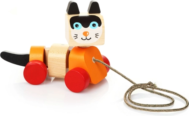 Jucăria de tras din lemn, proiectată în formă de pisicuță veselă, este ideală pentru divertisment și dezvoltarea abilităților motorii ale copiilor. Jucăria este echipată cu un trunchi flexibil și roți, ceea ce permite mișcări line și distractive la tragerea de șnur. Designul colorat atrage atenția copiilor și îi încurajează la joc activ.