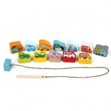 Setul de Cubika vehicule de transport din lemn de înșirat include 12 piese din lemn cu diverse motive de transport și o sfoară lungă de 45 cm cu un cârlig din lemn. Copiii își pot exersa memoria și îndemânarea folosind cele 8 modele incluse, în timp ce se distrează cu un joc educativ.