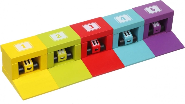 Cinci mașinuțe colorate și un set de cuburi transformă fiecare zi în curse captivante – de la start, prin boxe și până în garaj.