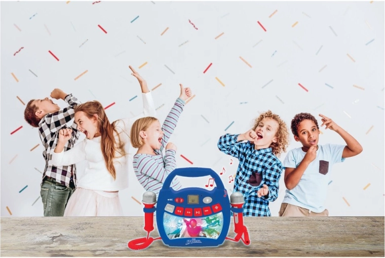 Playerul karaoke portabil se conectează ușor la alte dispozitive prin Bluetooth și spectacolul poate începe! Micii cântăreți vor aprecia cu siguranță efectele uimitoare de schimbare a vocii și funcția de înregistrare a propriei interpretări. Playerul are două microfoane integrate pentru duete grozave cu un prieten. În plus, efecte luminoase care clipesc în ritmul muzicii.