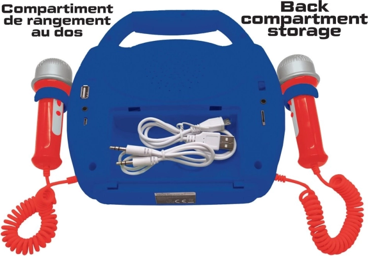 Player cu mâner pentru transport facil. Conectare ușoară la alte dispozitive prin funcția Bluetooth. Cu funcție de schimbare a vocii (activare pe microfon) și funcție de înregistrare. Dispozitivele audio pot fi conectate și prin cablu sau prin USB și slot pentru card TF/micro SD. Ieșire pentru căști (3,5 mm). Bateria reîncărcabilă și cablul sunt incluse în pachet. Potrivit pentru copii de la 3 ani.
