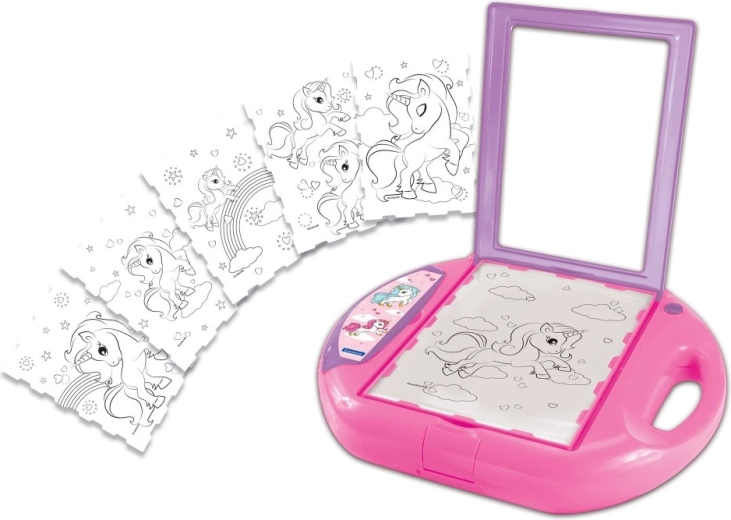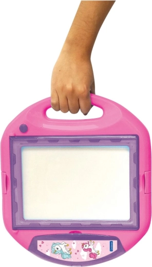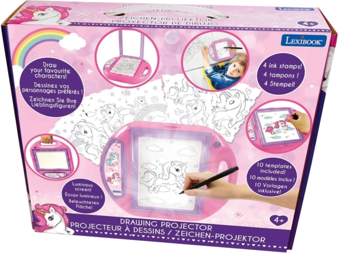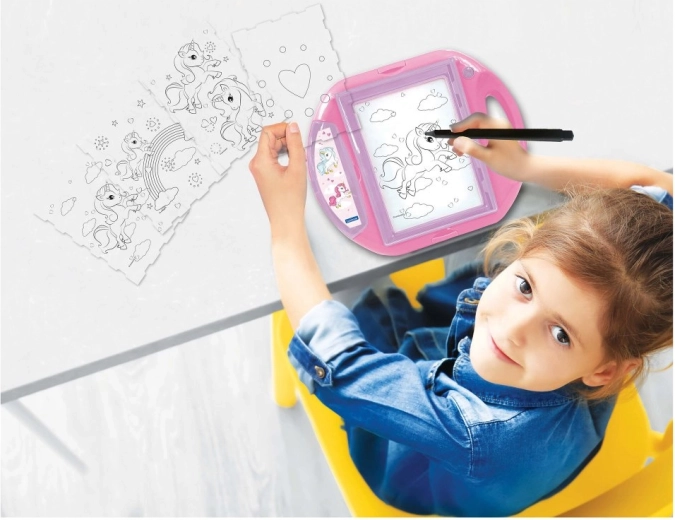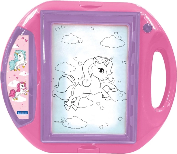 Proiectorul de desen format A5 este dotat cu 10 șabloane și 4 ștampile cu motivul unicornului de basm. Îi ajută pe micii artiști să învețe să deseneze în timp ce se distrează. Este foarte ușor de utilizat datorită ecranului luminos și setărilor practice și permite depozitarea tuturor accesoriilor, pentru a avea totul la îndemână. Este suficient să așezi unul dintre șabloane sub capacul de plastic, să pui hârtia deasupra, să închizi capacul și să desenezi. Ecranul se aprinde pentru a proiecta șablonul sub hârtie și pentru a ghida copilul în timpul desenului.