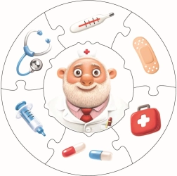 Puzzle-ul rotund cu personajul medicului îi învață pe copii să recunoască obiecte medicale de bază – de la stetoscop la termometru – și le dezvoltă vocabularul și asocierea logică.