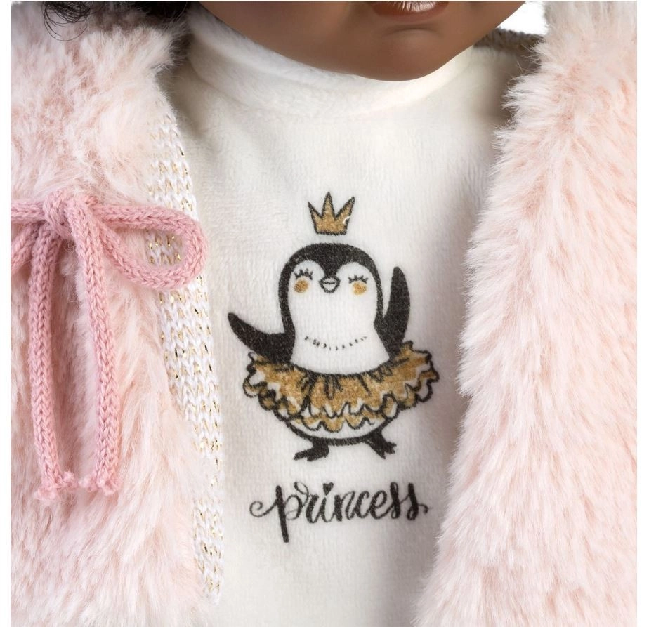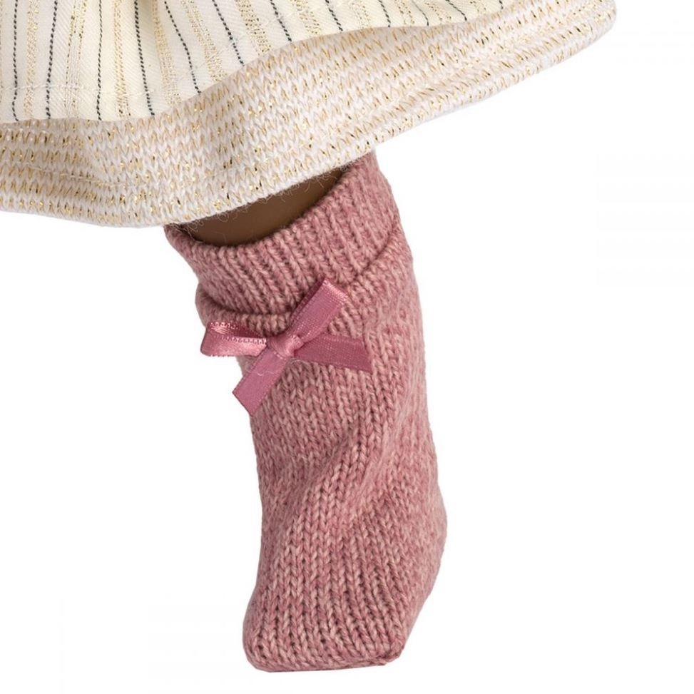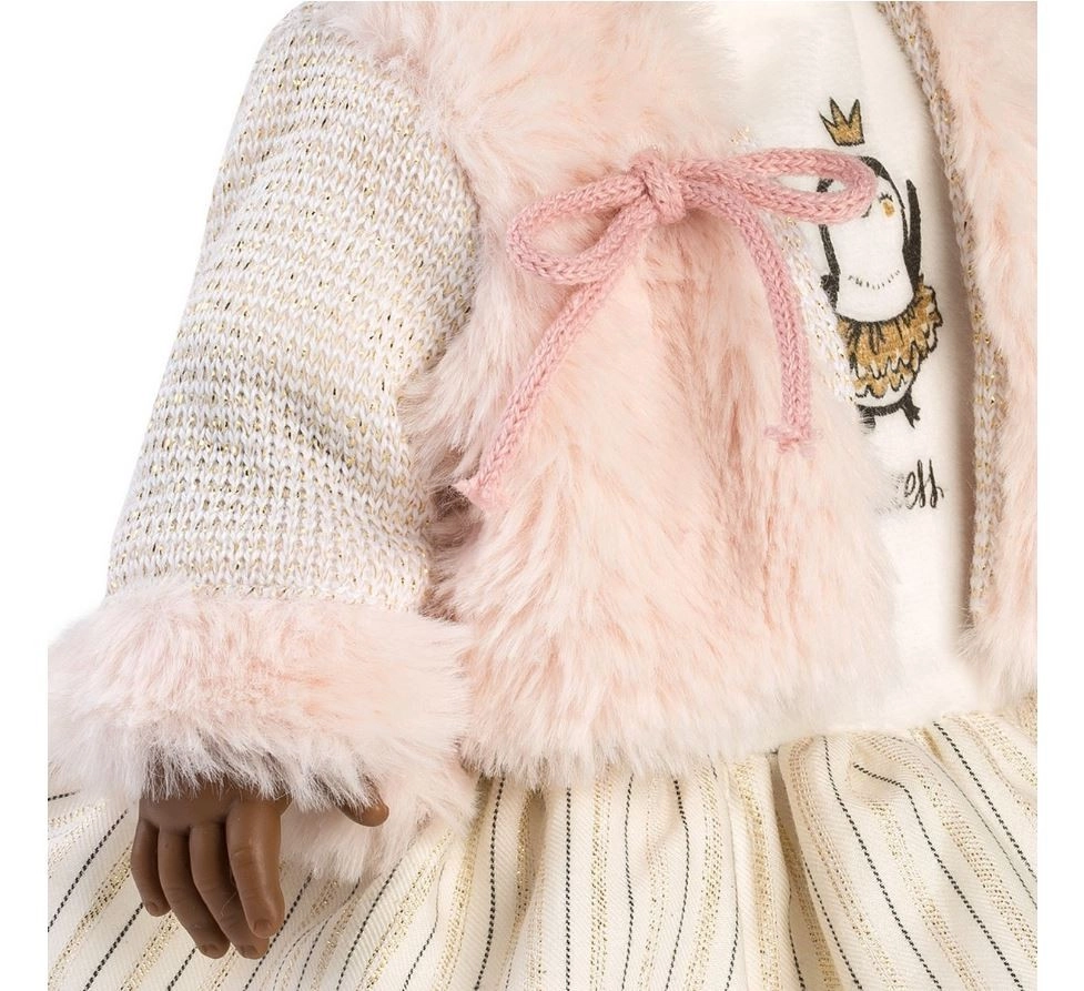 Corpul este moale și plăcut la îmbrățișat, capul, mâinile și picioarele sunt din vinil de calitate, plăcut la atingere. Hăinuțe cusute manual din țesături ale unor mărci renumite pentru copii și producția spaniolă LLORENS asigură durabilitate și execuție detaliată. Păpușa este livrată într-o cutie cadou, ideală pentru a fi oferită.