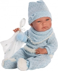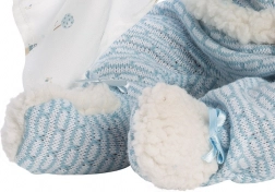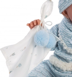 Pe lângă păturica albastră la modă, cu urechi, care se potrivește cu îmbrăcămintea sa, sunt incluse și un suzetă decorativă. Păpușa vine ambalată într-un ambalaj de cadou atractiv, care imită o casă marca Llorens.