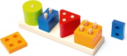 Acest puzzle din lemn de înaltă calitate oferă 16 forme geometrice colorate, care se înșiră pe știfturile bazei dreptunghiulare. Copiii, în timpul jocului, învață să recunoască culorile și formele, experimentează combinații diferite și își antrenează în mod natural coordonarea și răbdarea.