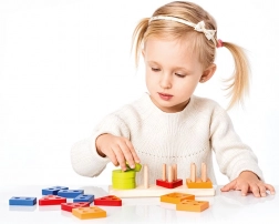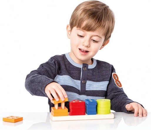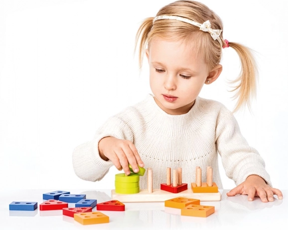 Înșirarea pieselor pe știfturi întărește coordonarea mână–ochi, precizia prinderii și concentrarea – abilități esențiale pentru vârsta preșcolară.
