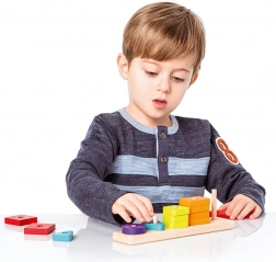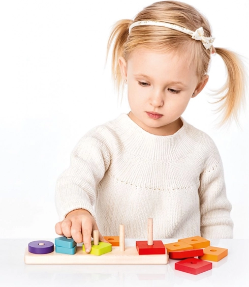 Așezarea formelor pe țăruși sprijină coordonarea mână–ochi, răbdarea și concentrarea; activitate ideală pentru copiii de la 18 luni.