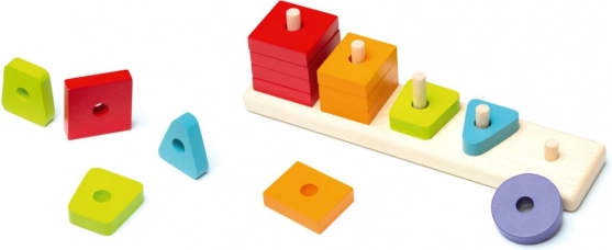 Datorită pieselor geometrice variate și culorilor care se repetă, copiii își însușesc ușor sortarea, asocierea și plasarea corectă pe țărușii bazei.