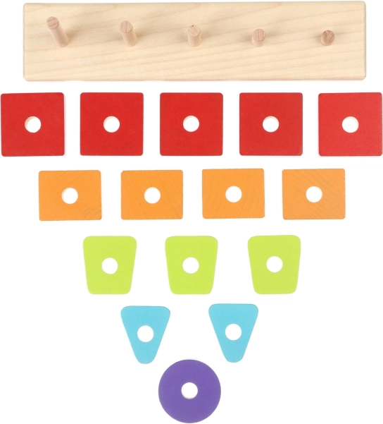 - Conținutul setului: 15 forme + bază din lemn cu țăruși (în total 16 piese)