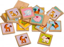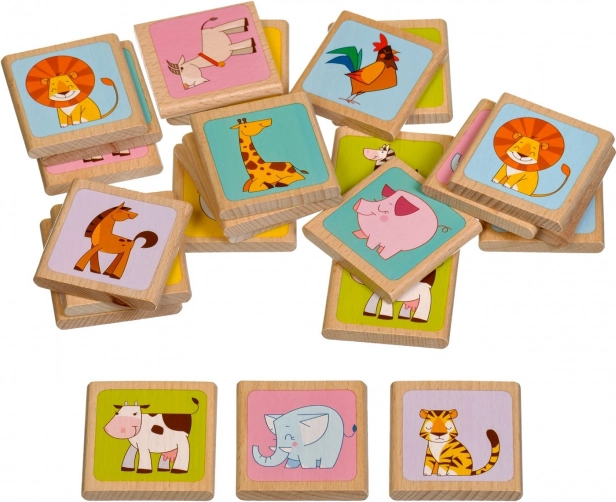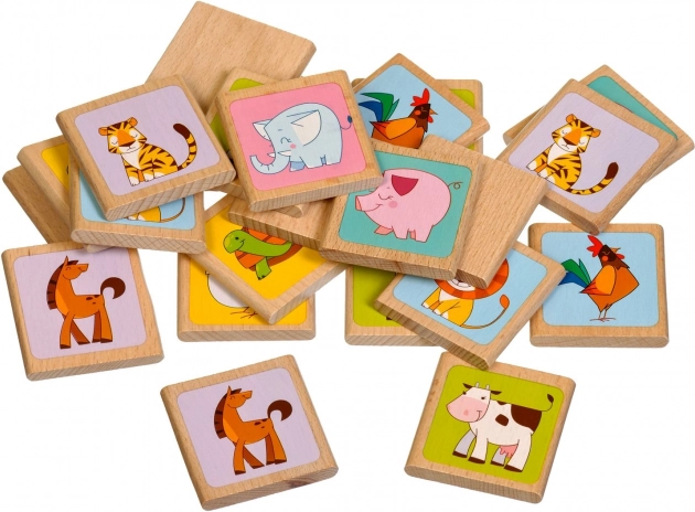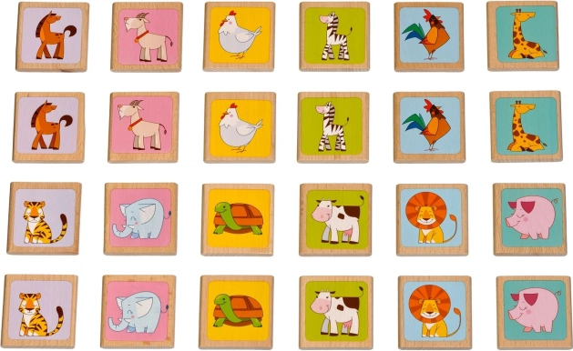 - 12 perechi de cartonașe din lemn (24 bucăți în total) cu motive vesele