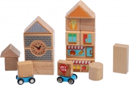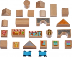 Construiți propriul orășel pitoresc din cuburi din lemn atent finisate și porniți la plimbare cu cele două mașinuțe mici. Piesele de forme diferite – paralelipipede, triunghiuri, cilindri și poduri – se combină perfect și îi motivează pe copii la construcții creative și joc liber.