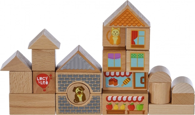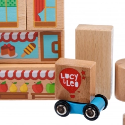 Descoperiți farmecul construcțiilor creative cu setul din lemn Lucy & Leo oraș. Setul conține 25 de piese din lemn de calitate, inclusiv 2 mașinuțe pe roți, în diverse forme și culori pentru a construi căsuțe și străduțe. Elementele ilustrate precum ferestre, acoperișuri și vitrine de magazine stimulează imaginația și jocul tematic. Jucăria sprijină motricitatea fină, gândirea logică și creativitatea, iar după joacă o puteți depozita ușor în cutia rotundă practică, cu capac și mâner.