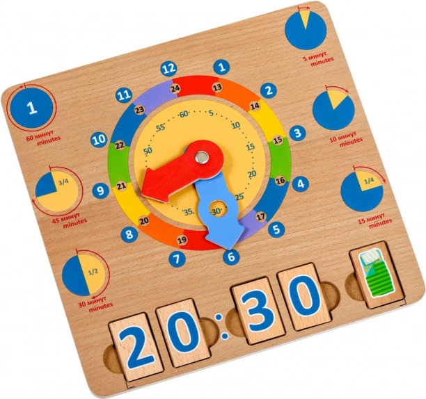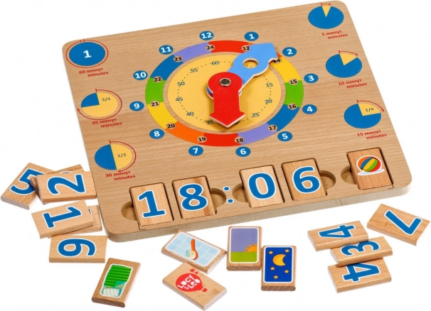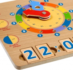 Tabla de joc din lemn Învățăm ceasul este un excelent material didactic ce susține învățarea naturală prin joc. Acele mari, colorate, și segmentele temporale clar delimitate le permit copiilor să înțeleagă mai ușor orele, minutele și activitățile zilnice la momente concrete.