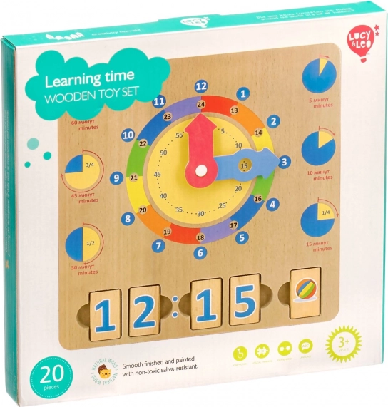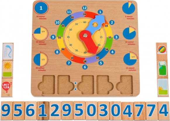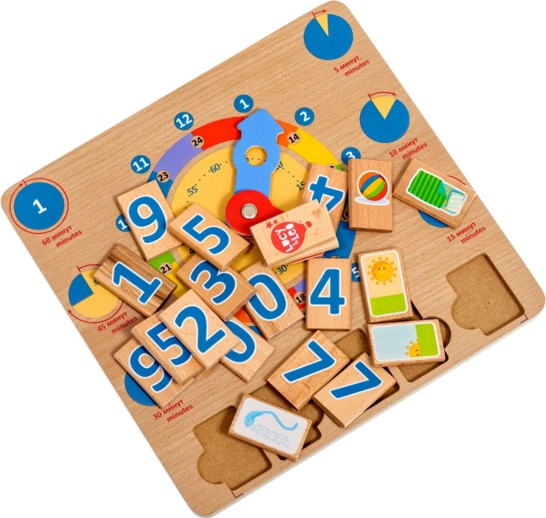 Pachetul include 14 blocuri numerice și 6 blocuri cu imagini ale activităților zilnice. Patru blocuri pentru timp pot fi introduse în locașurile pregătite pentru a crea ora digitală, în timp ce al cincilea bloc reprezintă activitatea corespunzătoare. Astfel, copiii conectează vizual ceasul analog cu afișarea digitală și rutina zilnică obișnuită.