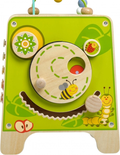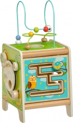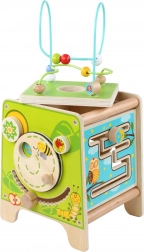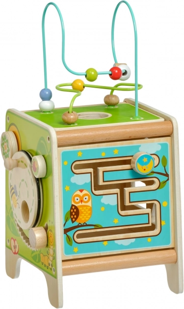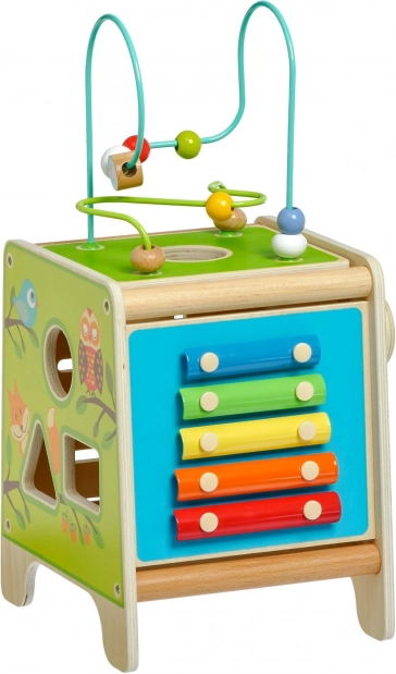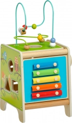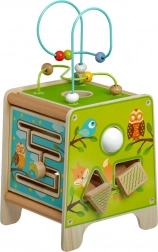 Acest cub activ colorat din lemn aduce copiilor ore de joacă cu sens. Labirintul cu mărgele de sus poate fi scos și întors în interiorul cubului pentru depozitare ușoară. Pe laturile cubului, copiii descoperă xilofon cu bețișoare, sortator cu forme geometrice rotative din două piese, labirint motric, rotiță rotativă, elemente pivotante și un joc distractiv de mutare a unui știft pe o șină.