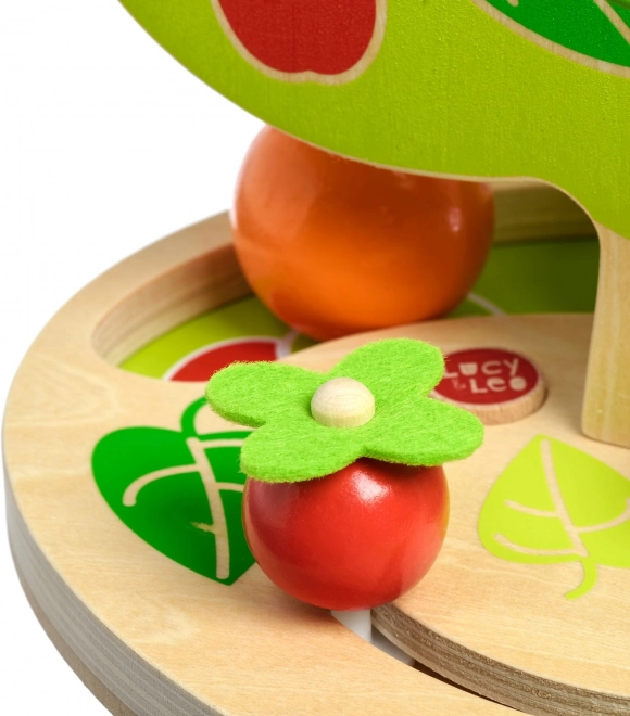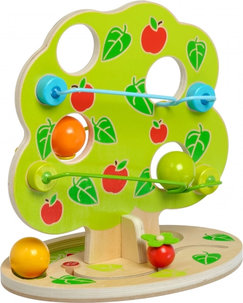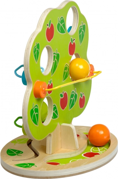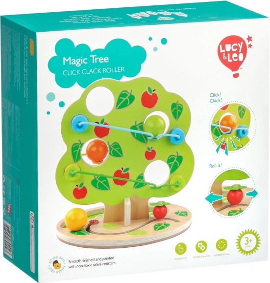 Toboganul cu bile cu design atrăgător în forma unui copac oferă mai multe șine dispuse în cascadă pe lateral. Doar așază una dintre bilele mari, netede, din lemn în vârf și urmărește cum se rostogolește în jos, producând un ritmic „ticăit” și oprindu-se la baza copacului. Jucăria este ideală pentru copiii activi, care iubesc mișcarea, sunetele și explorarea relației cauză–efect.