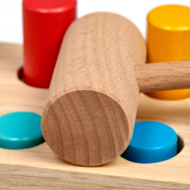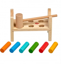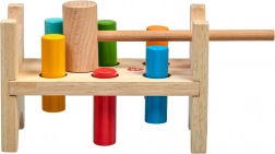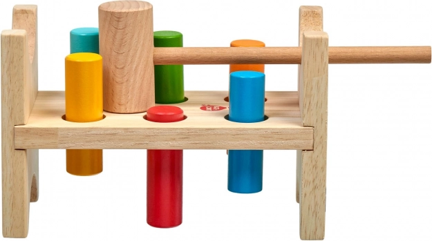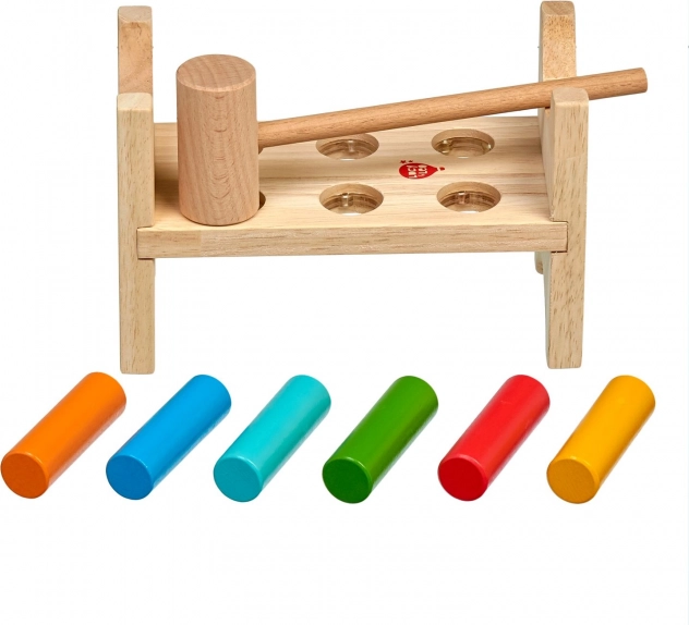 Cei șase țăruși colorați și ciocănelul din lemn îi învață pe copii priza precisă, forța loviturii și coordonarea mână–ochi.