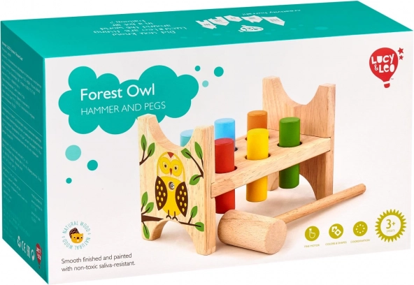 Acest banc de bătut din lemn, de calitate, cu motiv de bufniță din pădure, este jucăria ideală pentru copiii care iubesc distracția activă și plină de sens. Cei șase țăruși colorați și ciocănelul din lemn îi ajută pe copii să exerseze precizia loviturii, forța și ritmul.