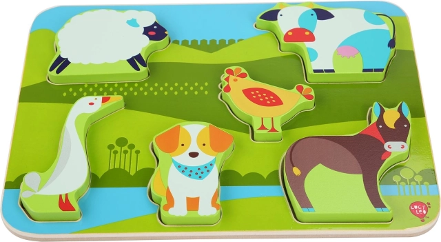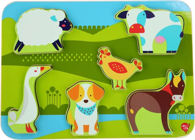 Descoperă puzzle-ul colorat din lemn cu tematică de fermă de la LUCY & LEO, ideal pentru copii de la 3 ani. Conține 7 piese solide cu animale, ușor de ținut în mână și de introdus în decupajele dedicate. Jucăria dezvoltă motricitatea fină, recunoașterea formelor și a animalelor și răbdarea. Piesele sunt suficient de mari și stabile, astfel încât pot sta și în picioare de sine stătător.