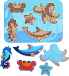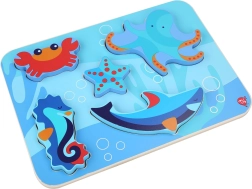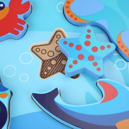 Puzzle-ul din lemn pentru copii cu tematică de viețuitoare marine este conceput pentru o învățare distractivă. Cele șase piese colorate – de exemplu caracatiță, stea de mare sau căluț de mare – se potrivesc perfect în formele frezate de pe placa robustă cu motiv oceanic. Piesele sunt suficient de mari pentru a fi ușor de ținut și, datorită grosimii lor, pot sta singure în picioare.