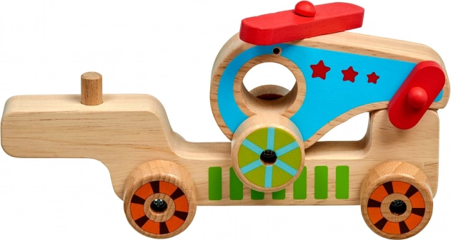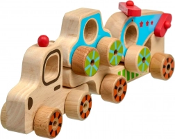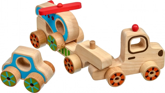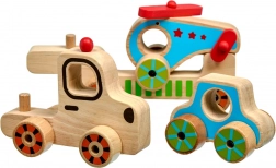 Acest puzzle din lemn pentru cei mici îmbină distracția cu învățarea. Copiii pot conduce separat camionul, mașinuța și elicopterul, apoi le pot încărca pe platformă și porni „la drum”. Accentele colorate și formele simple ajută la dezvoltarea percepției vizuale, în timp ce manipularea pieselor antrenează prinderea și îndemânarea.