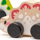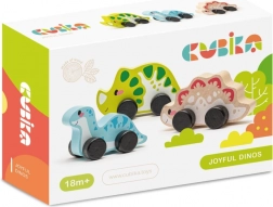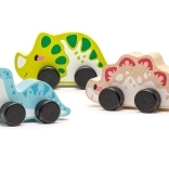 Setul conține trei dinozauri din lemn cu roți pentru o mișcare ușoară, ideali pentru cei mici.