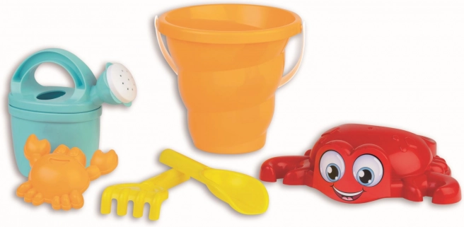 Vă prezentăm un set de nisip format din 6 piese care va înveseli orice joc pe plajă sau în locul de joacă cu nisip. Include o găleată ce amintește de forma unei scoici, o sită cu motiv de crab vesel, o formă de crab, o stropitoare practică, o lopățică și o greblă, garantând ore întregi de distracție creativă pentru copii dumneavoastră.