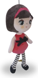 Păpușa este îmbrăcată în rochii roșii cu fundă neagră, care atrage atenția.