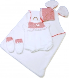 În set este inclus un pachet din 3 piese și o salteluță decorativă cu urechiușe pentru și mai multă distracție în îngrijirea păpușii. Ambalat într-o folie de plastic cu umeraș din plastic sau carton – ușor de depozitat și de oferit cadou.
