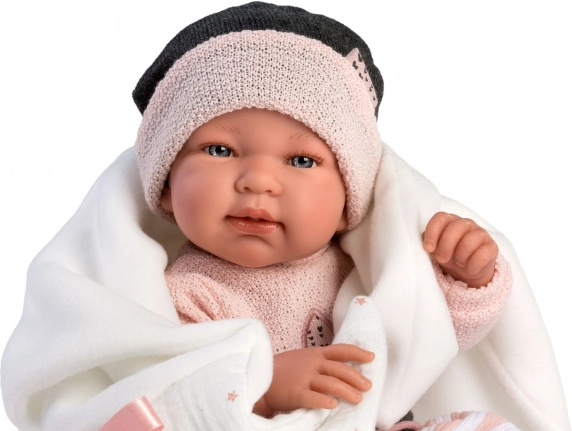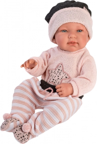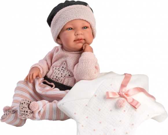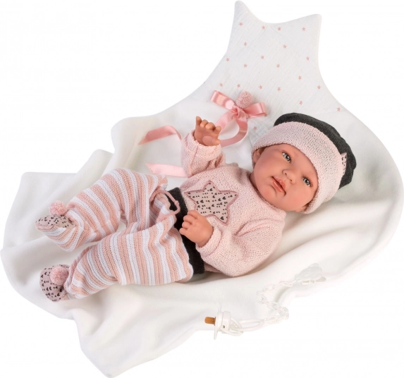 Set stilat de hăinuțe în 3 piese pentru păpușa New Born LLORENS, mărimea 43–44 cm, impresionează prin aspect realist și execuție de calitate. Setul include piese asortate și o păturică decorativă, ideale pentru schimbat și jocuri de rol. Fabricat în Spania, ambalat cu umeraș practic. Materiale de calitate, croială precisă și potrivire impecabilă pentru păpușile de mărime standard.