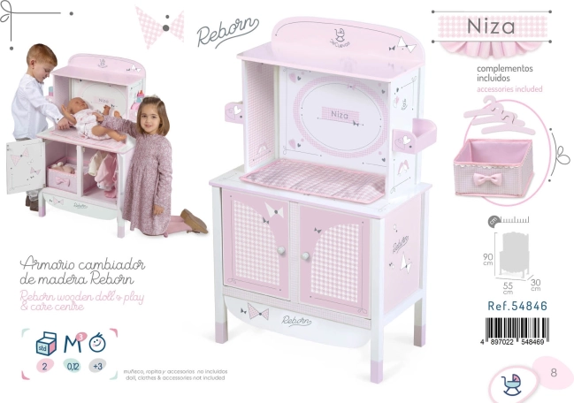 Descoperiți colecția Niza, într-un roz delicat, cu acest șifonier frumos și practic pentru păpuși, care îmbină spațiul de depozitare și centrul de înfășat. Partea inferioară oferă o bară pentru umerașe și un sertar pentru haine, iar partea superioară servește drept masă de înfășat, cu imprimeu în designul colecției.